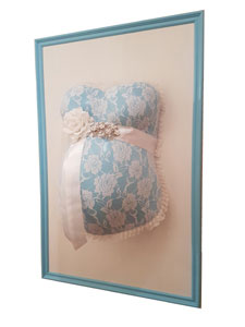 Blauer Babybauch mit weiß geblümten Stoffüberzug, Spitzenbordüre, Schleifenband, Stoffrose und Blumenbrosche, auf weißer Rückwand mit blauem Bilderrahmen und Beleuchtung mit LED Farbwechsler und Fernbedienung.