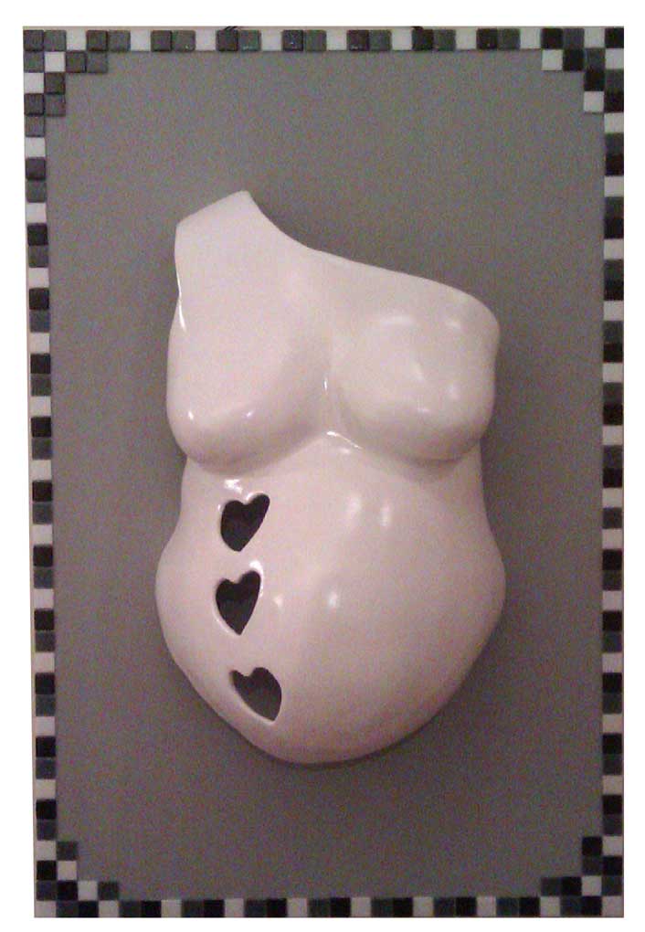 Weißer Babybauch mit drei Herzchen-Ausschnitten auf grauer Rückwand mit weiß, grau, schwarzem Mosaikrahmen und Beleuchtung mit LED Farbwechsler und Fernbedienung.